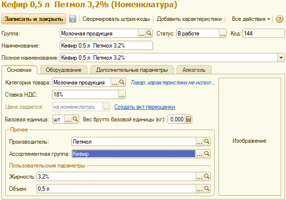 Для того чтобы номенклатура могла участвовать в создании ассортиментной матрицы, для нее необходимо задать ассортиментную подгруппу в карточке товара на закладке «Основная» (в данном примере подгруппа «Кефир»), и значения выделенных потребительских свойств.