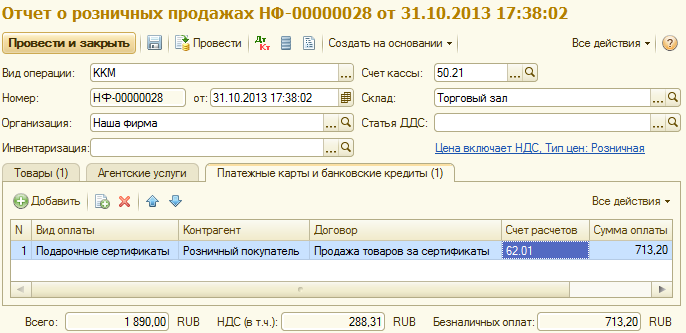 Последний документ используется для выгрузки в бухгалтерию данных о продажах подарочных сертификатов.