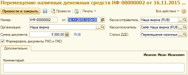 - Сумма документа - количество наличных денег, перемещаемое между кассами;