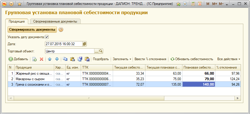Задать новую плановую себестоимость можно, вручную указав ее в колонке «Плановая себестоимость», или через изменение % отклонения от текущей себестоимости.
