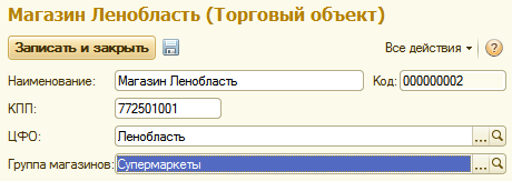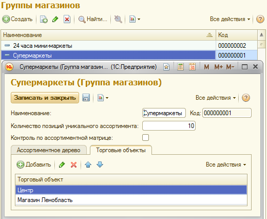 В табличной части на закладку «Торговые объекты» добавляются магазины (торговые объекты), объединяемые в группу.