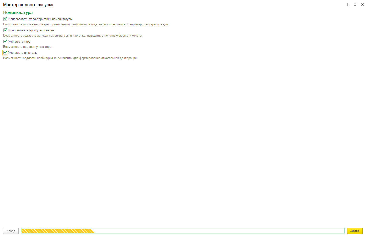Если на первом шаге мастера вы выбрали функционал продуктовой розницы, то часть категорий на этом шаге будет уже предзаполнена.