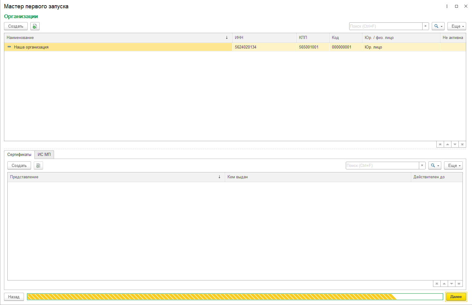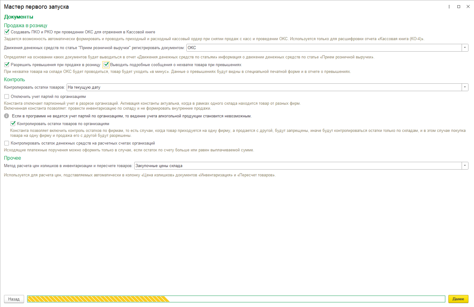 «Мастер первого запуска» (далее Мастер) позволяет произвести первоначальное заполнение настроек конфигурации, задать структуру магазинов и указать важнейшие настройки. При первом запуске также заполняются статьи доходов и расходов по умолчанию.
