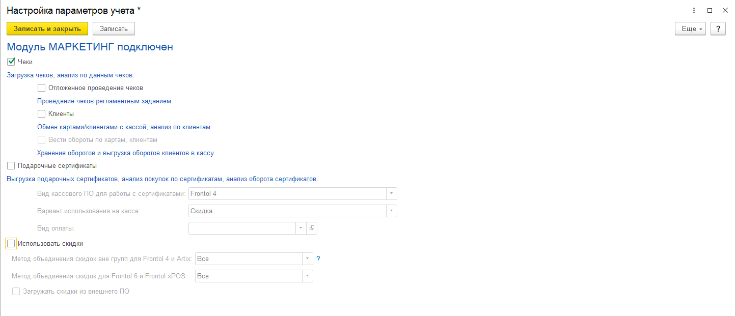 Подробно настройки описаны в соответствующем разделе документации (закладки «Основные», «Номенклатура», «Документы», «Маркировка» настроек параметров учета) и здесь не дублируются.