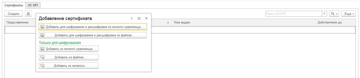 На закладке «Сертификаты» можно добавить сертификат для подписания документов электронной подписью при обмене через ЭДО. Можно добавить сертификат из установленных на компьютере.