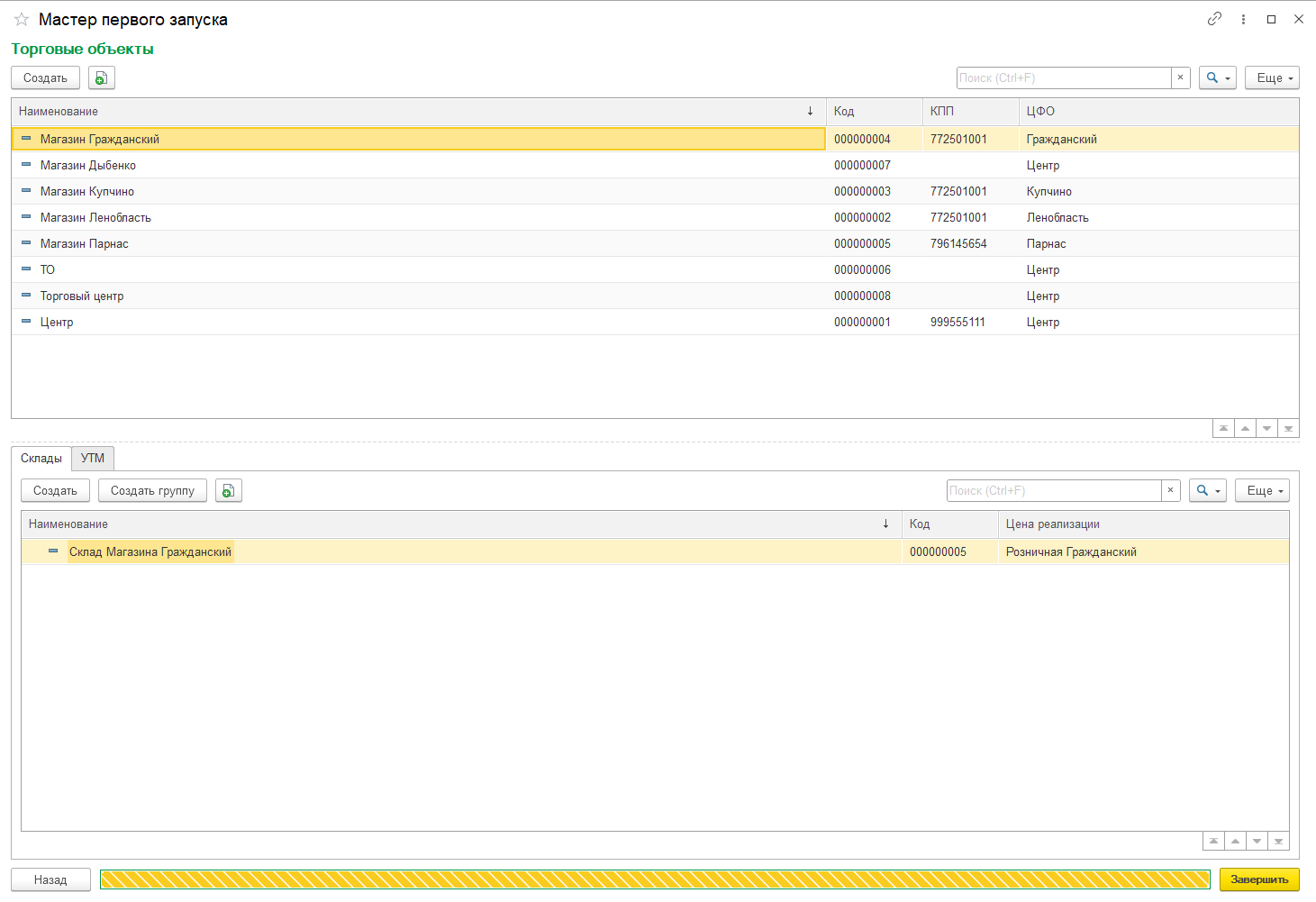 Склады и УТМ по выделенному торговому объекту отображаются ниже на закладках «Склады» и «УТМ» соответственно. Здесь же можно добавить новые.