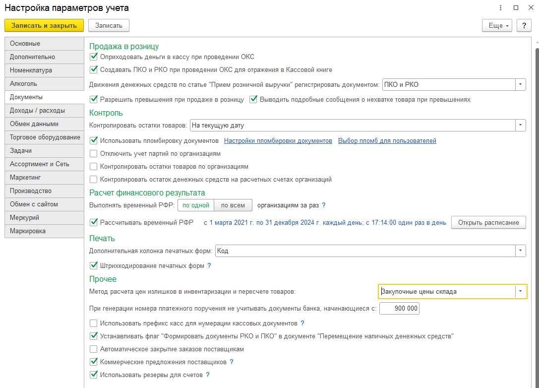 Константа влияет на формирование отчета «Движения денежных средств по статьям» и определяет на основании каких документов будет выводиться в отчет информация о движении денежных средств по статье «Прием розничной выручки». - Разрешить превышения при продаже в розницу — при нехватке товара на складе ОКС будет проводиться, товар будет уходить «в минус». Данные о превышениях будут видны в специальной печатной форме и в отчете о превышениях.