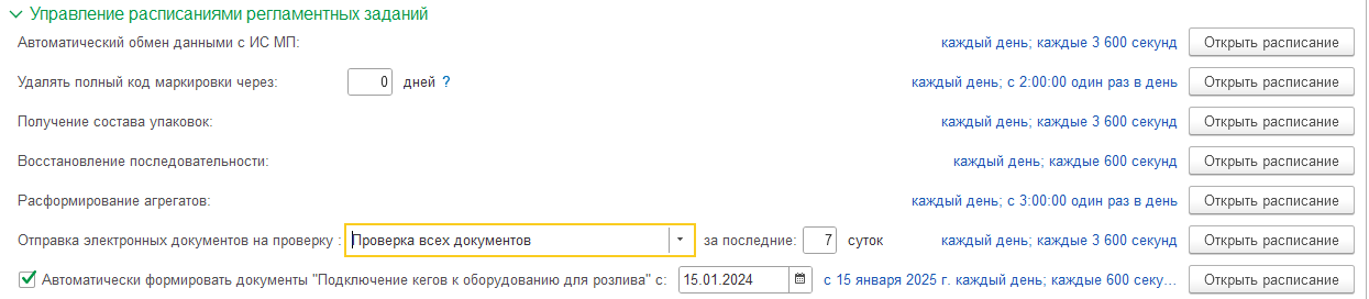 В секции Управление расписаниями регламентных заданий настраивается расписание для автоматического выполнения различных операций, связанных с маркировкой товаров.