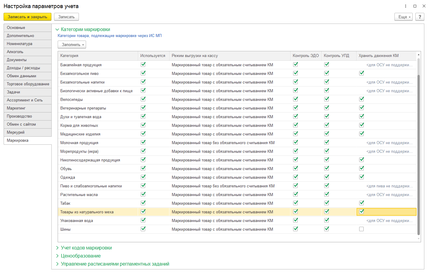 В разделе Категории маркировки выбираются те категории маркируемых товаров, учет по которым планирует вести предприятие. Также вы можете включить/выключить настройку Хранить движения КМ по тем категориям, которые предполагают помарочный учёт (за исключением Пива и слабоалкогольных напитков).