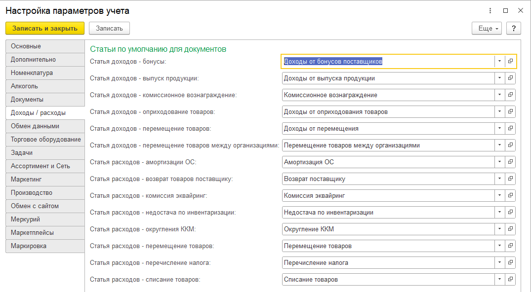 На закладке можно задать статьи, на которые будут распределяться некоторые доходы и расходы предприятия: