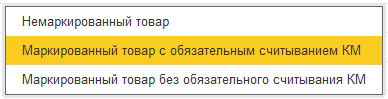 - Маркированный товар с обязательным считыванием КМ — в этом случае товары будут выгружаться как маркированные с обязательным считыванием КМ.