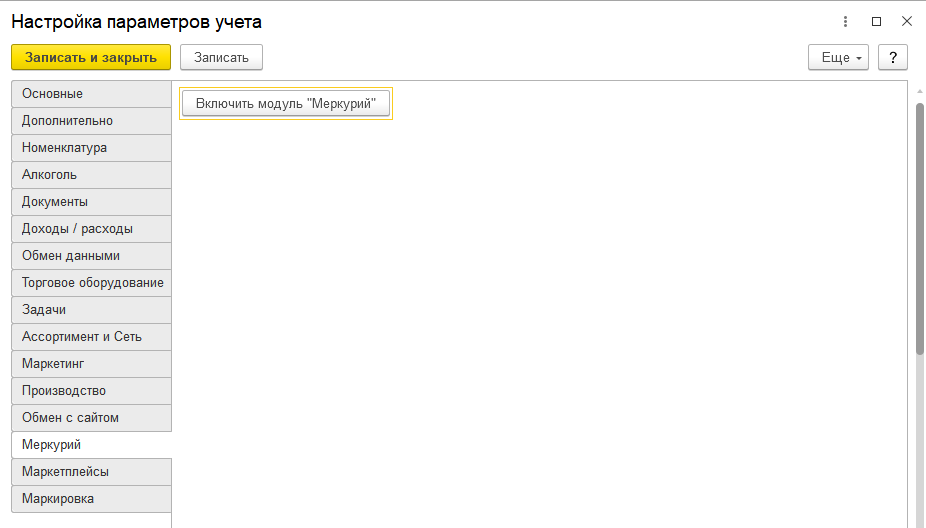 На данной закладке осуществляется подключение модуля «Меркурий». Модуль является дополнением к основной конфигурации и приобретается отдельно.