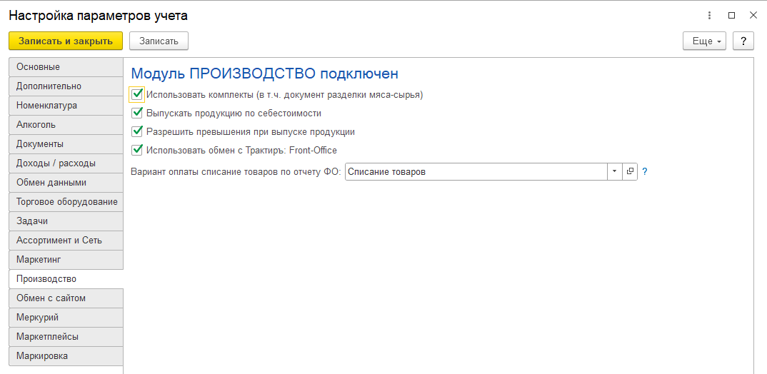 На данной закладке осуществляется подключение модуля «Производство» и настройка его констант.