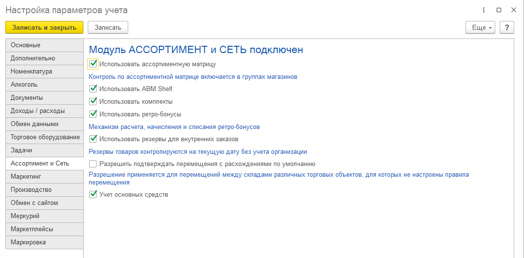 На данной закладке осуществляется подключение модуля «Ассортимент и сеть» и настройка его констант.