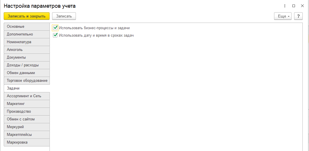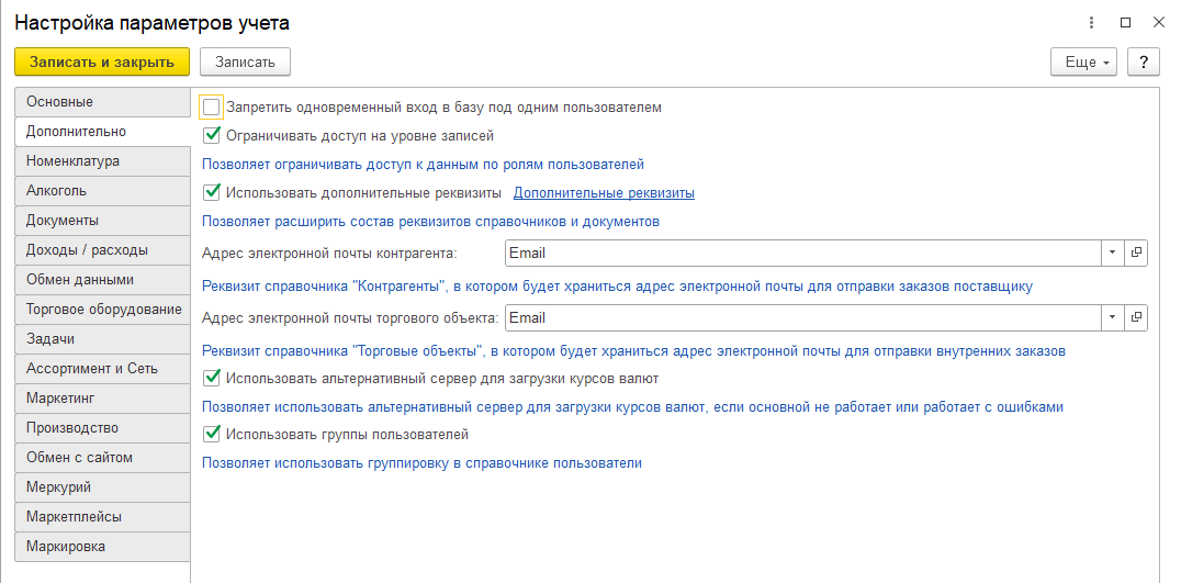 - Учитывать алкоголь — константа задает возможность ведения учета алкогольной продукции, формирования регламентированной отчетности по алкоголю, а также возможность осуществлять обмен с ЕГАИС.
