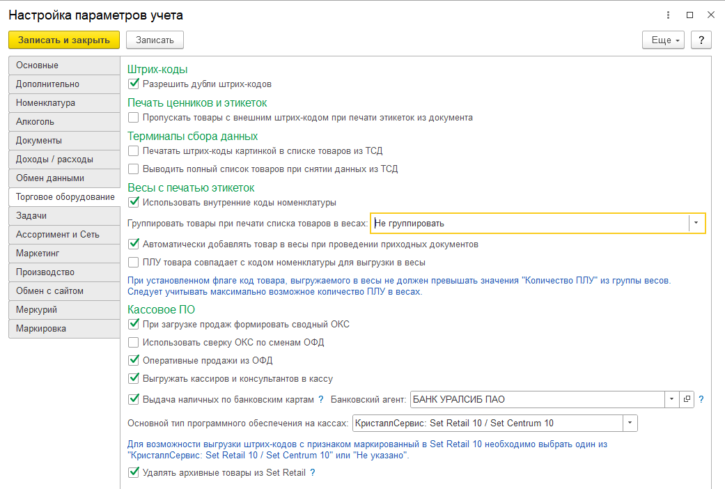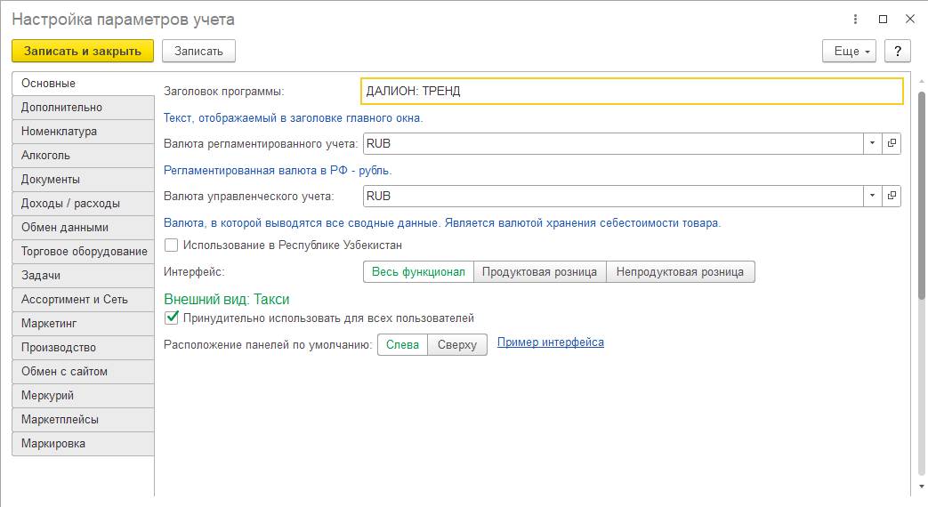 - Интерфейс — в зависимости от вида магазина может быть выбран интерфейс, в котором ограничивается видимость справочников, документов, реквизитов, не относящихся к виду деятельности. Для продуктовой розницы это артикулы товаров. Для непродуктовой розницы — все что связано с весовым товаром, естественной убылью, алкоголем.