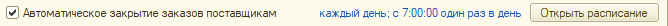 - Автоматическое закрытие заказов поставщикам — при включенной константе можно настроить расписание для автоматического закрытия заказов регламентным заданием.