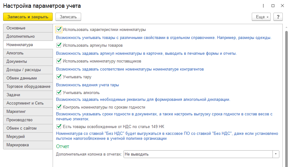 - Дополнительная колонка в отчетах — настройка вывода дополнительной информации в отчеты с номенклатурой: Код, Не выводить. При включенной константе «Использовать артикулы товаров» доступны еще два варианта — Артикул или Артикул и Код.