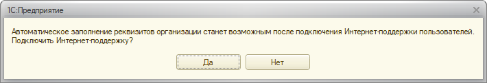 Если в программе не заполнены логин и пароль пользователя Портала 1С: ИТС или данные некорректны, перед заполнением реквизитов контрагента отображается сообщение о необходимости подключения Интернет-поддержки пользователей.
