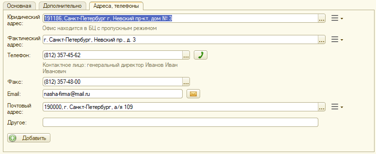 Здесь добавляются юридический, фактический и почтовый адреса организации, номера телефонов и факсов, e-mail и другие сведения.