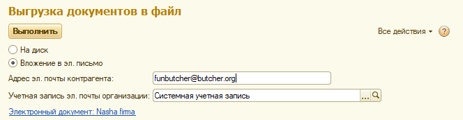 По кнопке можно выгрузить реквизиты в файл на компьютер или отправить их контрагенту на электронную почту.