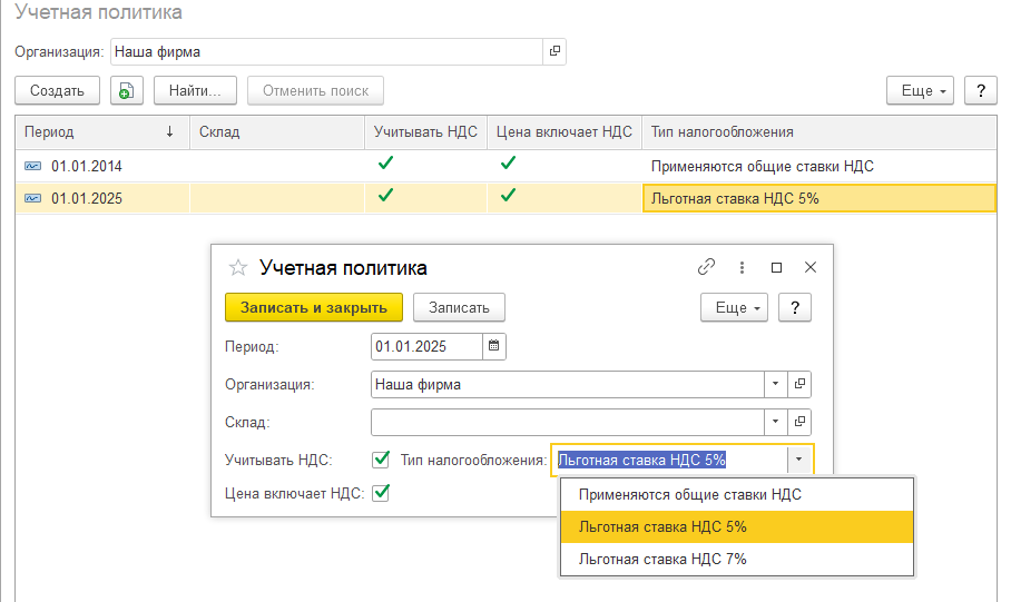 Для отражения изменений в учетной политике фирмы в отношении какого-либо склада по кнопке «Создать» (Ins) вызывается новая строка, на которой выставлением флажков определяется, является или нет данный склад плательщиком НДС, выбирается тип налогообложения и выставляется дата, с которой этот период наступил. Период смены учетной политики не может быть меньше месяца, т.е. если вы установили учётную политику с 01.01.2025, то добавить новую строку на тот же склад (или без указания склада) можно будет с 01.02.2025 г.