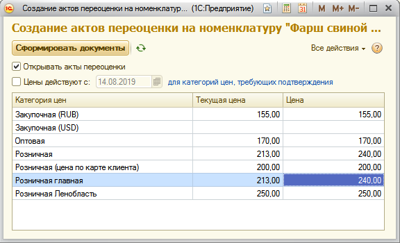 По итогу введенных новых цен в колонке Цена будут сформированы документы Акт переоценки.