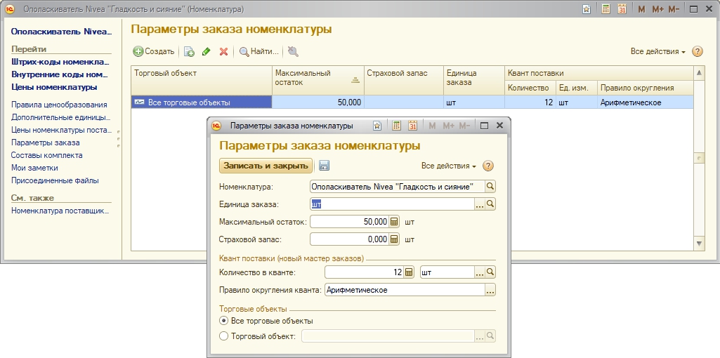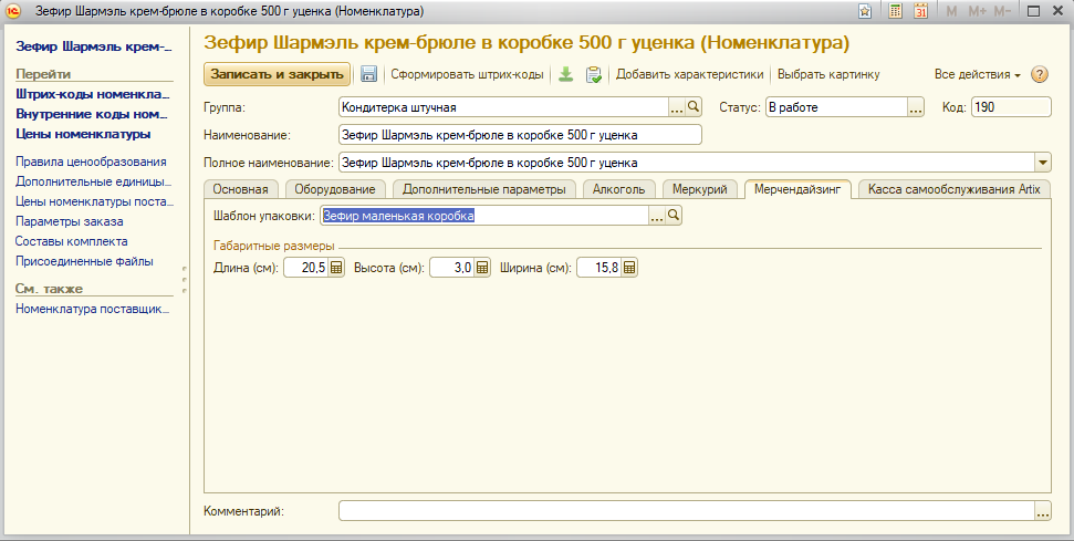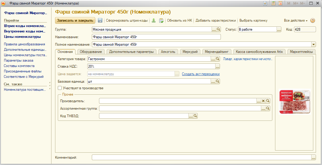 Вся информация о товаре доступна в карточке в основной форме и ее закладках, а также в панели навигации. В основную форму вынесены все основные параметры номенклатуры.