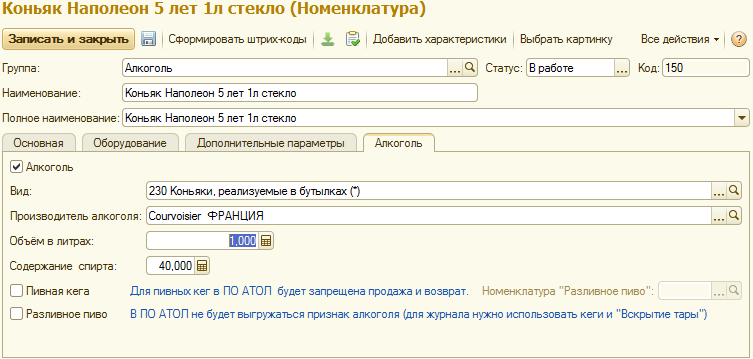 Сведения, указанные на этой закладке, будут использованы для формирования алкогольной декларации. Также реквизиты алкоголя необходимы для учета излишков в инвентаризации, пересчете и перемещении товаров.