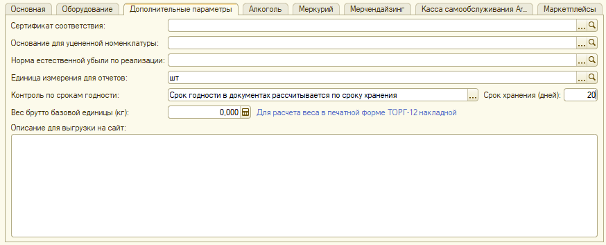 На четвертой закладке «Алкоголь» флажком отмечается принадлежность товара к алкогольной продукции. В этом случае становится необходимым указание вида алкогольной продукции и производителя алкоголя, а также объема в литрах и при необходимости — процента содержания спирта. Если алкоголь является разливным пивом, должен быть проставлен один из флагов: «Пивная кега» или «Разливное пиво». Подробнее об учете разливного алкоголя см. в соответствующем разделе.