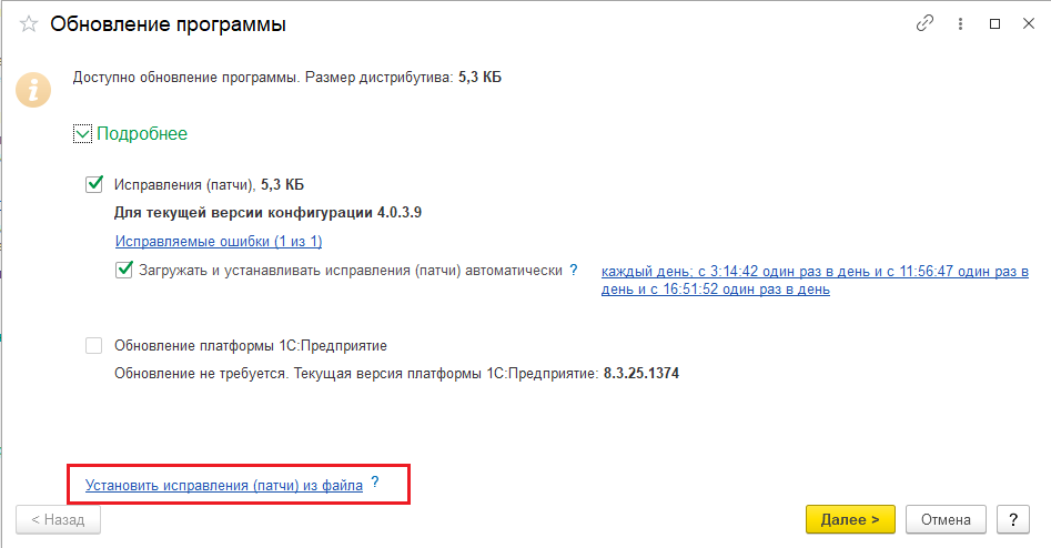 В случае если у вас подключена Интернет-поддержка пользователей, доступны также будут и патчи для типовых подсистем.