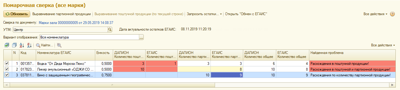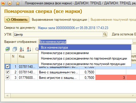 - Номенклатура с расхождениями по партионной продукции (только для сверки на основании документа «Марки зала» с видом «полностью считаны»)