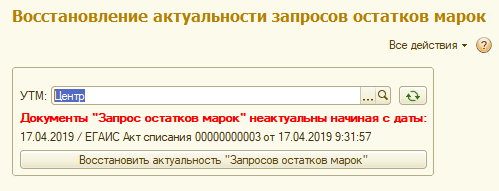 Дата и время должны соответствовать текущему дню. За контроль актуальности остатков отвечает регламентное задание "Восстановление актуальности "Запросов остатков марок" и "Запросов остатков складов".