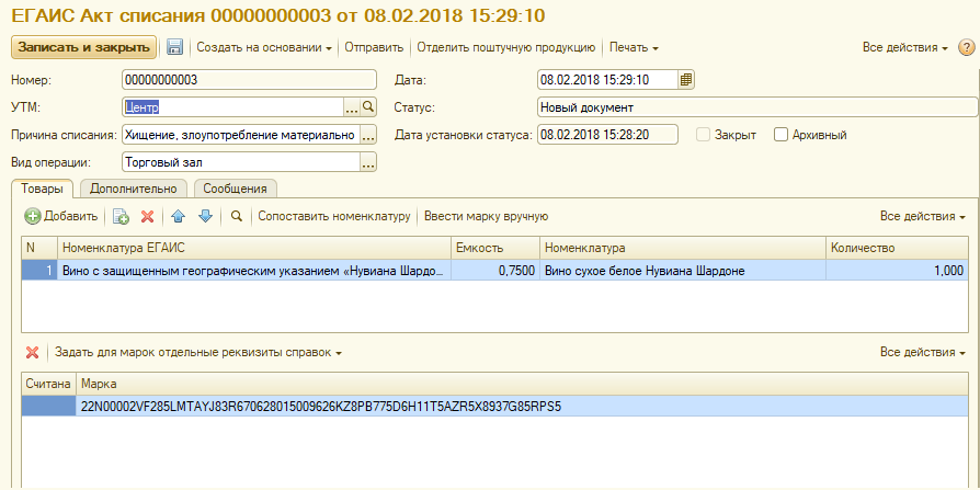 В шапке акта списания обязательно указывается УТМ для выгрузки данных в ЕГАИС и причина списания.