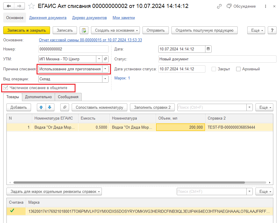 В шапке акта списания обязательно указывается УТМ для выгрузки данных в ЕГАИС, причина списания: "Использование для приготовления коктейлей (блюд)" и признак "Частичное списание в общепите".
