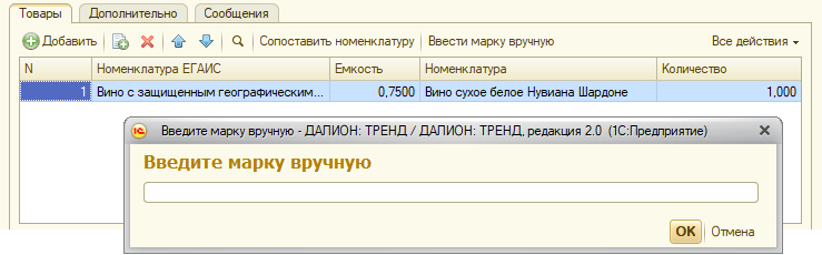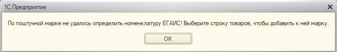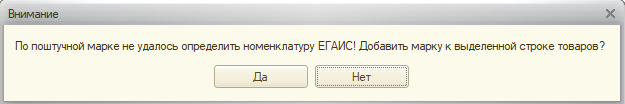 - если по данной марке отсутствует номенклатура ЕГАИС, то будет выдано сообщение, с возможностью добавления марки к выделенной строке товаров