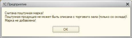 В акт списания с видом операции «Торговый зал» нельзя добавить поштучную продукцию, поскольку данная продукция не хранится на 2 регистре. При попытке добавления марки нового образца в документ, будет выведено предупреждение: