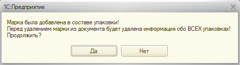 При считывании марки из упаковки она будет удалена, а для всех марок из этой упаковки будет снят признак «Штрих-коды упаковок», о чем будет выдано соответствующее предупреждение.