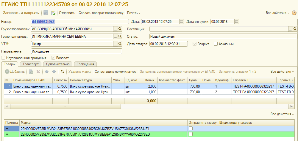 Марки при необходимости считываются в документ сканером. Если документ создан из входящей ТТН, то марки будут подставлены из документа-основания.