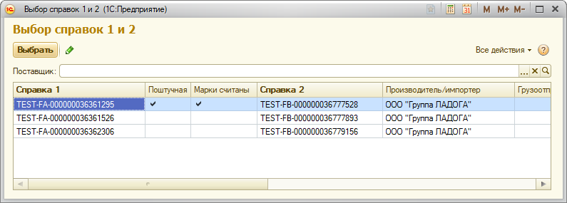 - вручную - по кнопке открывается форма выбора справок 1 и 2 с фильтром по поставщику из ТТН. В этой форме выводятся только те справки, которые есть на остатках организации по данным ЕГАИС. При выборе справки 1 или 2, другая, связанная с ней справка, будет выбрана автоматически.