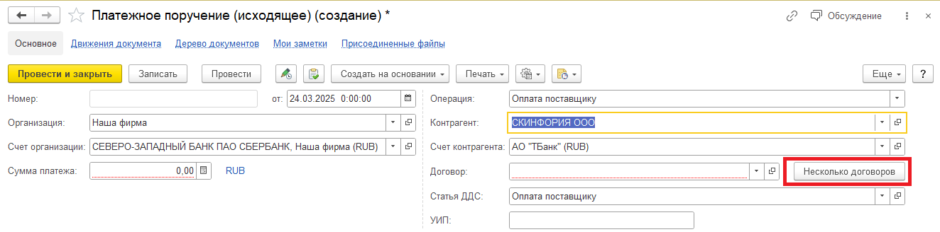 В шапке заполняются реквизиты: организация, от имени которой оформляется платежное поручение, и ее банковский счет; контрагент, счет контрагента, договор, по которому происходит оплата и статья ДДС; вводится сумма платежа.