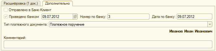 На закладке «Дополнительно» доступна информация о том, было ли платежное поручение отправлено в Банк-клиент и когда оно было проведено банком. Номер и дата по банку подставляются автоматически при сохранении документа.