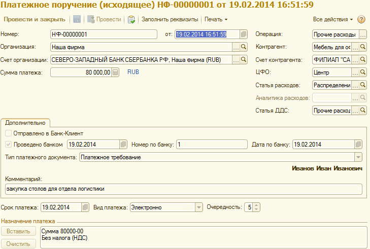 Документ «Платежное поручение» предназначен для выписки и печати платежного поручения в банк, а также для отражения движения денежных средств при безналичных расчетах.