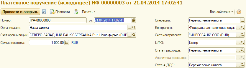 В шапке платежного поручения с такой операцией заполняются, помимо прочих, данные о ЦФО, от которого осуществляется платеж, и статья расходов, на которую будет записана сумма платежа.