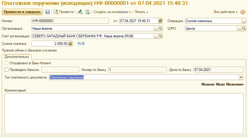 Вид операции Снятие наличных — используется для оформления платежного поручения на получение наличных в банке, когда возникает необходимость пополнить кассу (сейф) организации наличностью.