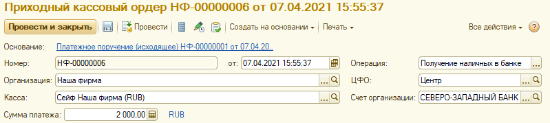 На основании формируется Приходный кассовый ордер с видом операции Получение наличных в банке, в котором нужно указать кассу оприходования снятой суммы наличных денег. Приходный кассовый ордер с этим видом операции делает движения только по кассе, а движения по банку делает "Платежное поручение" с видом операции Снятие наличных.