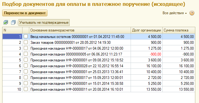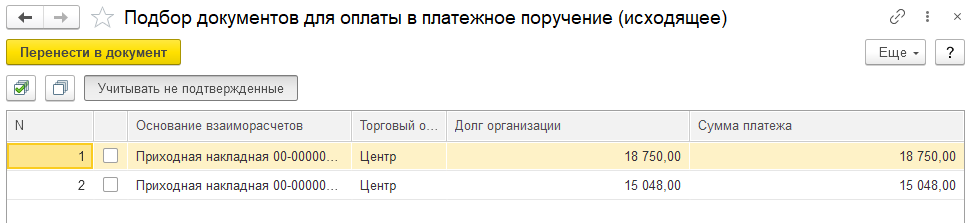При подборе документов в платежное поручение по кнопке "Подбор" открывается форма, в которой нужно флагами отметить нужные документы и нажать "Перенести в документ". При этом по кнопке "Учитывать не подтвержденные" можно отключить отображение документов, по которым уже были созданы платежные поручения, утвержденные банком.