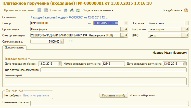 Документ «Платежное поручение (входящее) с видом операции Инкассация также может быть добавлен на основании документа «Расходный-кассовый ордер» с видом операции Инкассация.