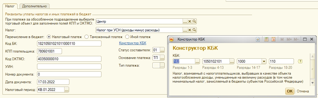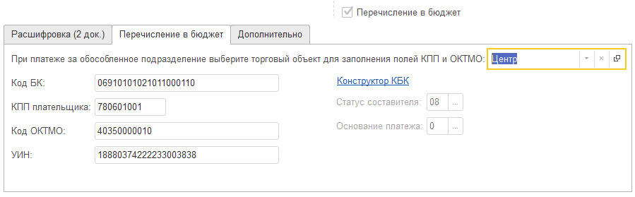 - Код БК — указывается код бюджетной классификации (КБК). Для удобства доступен конструктор КБК.