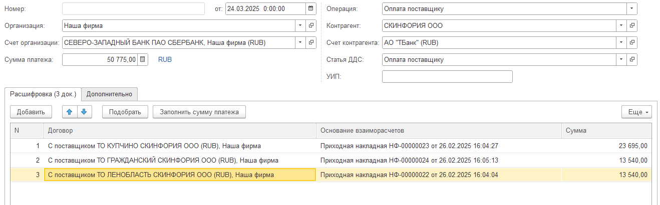 В этом случае в табличную часть подбирается сначала договор, а потом документ-основание по которому будет производиться оплата.
